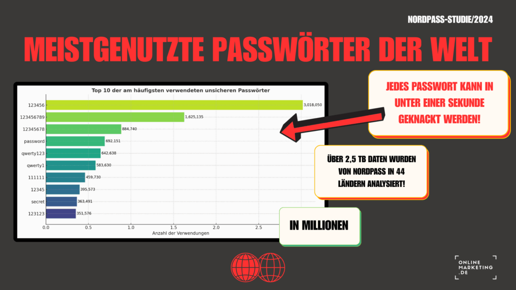 Die meistgenutzten Passwörter der Welt stellen ein Sicherheitsrisiko dar, © OnlineMarketing.de mit NordPass-Daten via Canva