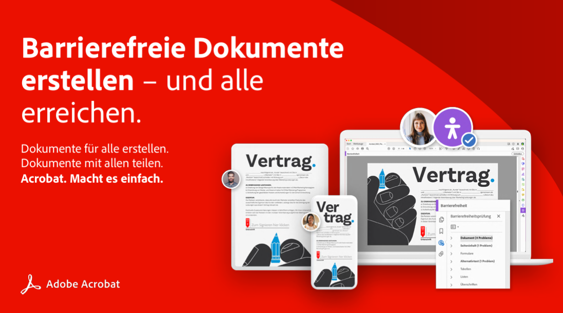 Werbegrafik von Adobe Acrobat mit dem Text „Barrierefreie Dokumente erstellen – und alle erreichen“ und Beispieldokumenten auf Laptop, Tablet und Smartphone, inklusive geöffneter Barrierefreiheitsprüfung.