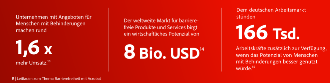 Infografik mit drei Kennzahlen: 1,6‑mal mehr Umsatz durch barrierefreie Angebote; 8 Billionen US‑Dollar Marktpotenzial weltweit; 166.000 zusätzliche Arbeitskräfte für den deutschen Arbeitsmarkt bei besserer Inklusion.