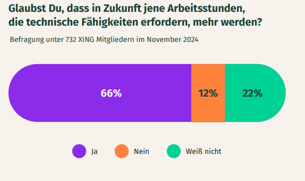 Balkendiagramm einer XING-Umfrage von November 2024 mit der Frage: „Glaubst Du, dass in Zukunft jene Arbeitsstunden, die technische Fähigkeiten erfordern, mehr werden?“ – 66 Prozent antworten mit Ja, 12 Prozent mit Nein, 22  Prozent mit „Weiß nicht“.