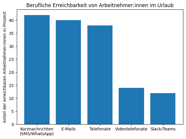 Wenn Arbeitnehmer:innen im Urlaub erreichbar sind, dann laut Studie vor allem über digitale, asynchrone Kanäle. 42 Prozent lesen Kurznachrichten wie SMS oder WhatsApp Messages, 40 Prozent werfen zumindest einen Blick ins berufliche E-Mail-Postfach. Das klassische Telefonat folgt mit 38 Prozent knapp dahinter. Deutlich seltener sind direkte digitale Meetings: Nur 14 Prozent stehen für Videotelefonate zur Verfügung, und lediglich zwölf Prozent reagieren auf Nachrichten über Kollaborations-Tools wie Teams oder Slack.
