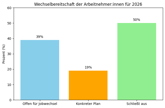 Ein weiteres Indiz für die berufliche Dynamik ist die Wechselbereitschaft. So planen viele Menschen, sich in 2026 beruflich neu zu orientieren. Knapp vier von zehn Beschäftigten (39 Prozent) ziehen einen Jobwechsel in Erwägung, 19 Prozent planen ihn bereits fest. Gleichzeitig schließen 50 Prozent einen Wechsel kategorisch aus, ein Hinweis darauf, dass Stabilität und Perspektive im bestehenden Umfeld für viele weiterhin attraktiv bleiben.