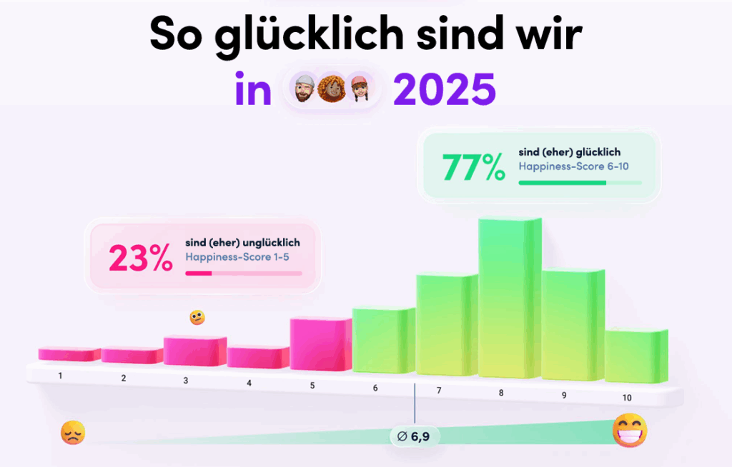 Ein Blick auf die einzelnen Branchen zeigt ebenfalls unterschiedliche Ergebnisse in Sachen Arbeitszufriedenheit. Die White-Collar-Branche führt in puncto Arbeitsglück mit einem Durchschnittswert von 7,5 und konnte sich damit im Vergleich zum Vorjahr (6,6) deutlich steigern. Am unteren Ende des Glücksspektrums steht ausgerechnet der Tech- und IT-Sektor. Noch im vergangenen Jahr Spitzenreiter:in mit 7,4, fällt der Bereich dieses Jahr auf 6,8 – ein spürbarer Rückgang. Die Gründe dafür dürften vielfältig sein: Fachkräftemangel, hohe Erwartungshaltungen, Unsicherheit durch Automatisierung – die Branche steht unter Druck. Doch gerade hier zeigt sich, wie wichtig gezielte Maßnahmen zur Förderung von Zufriedenheit und Wohlbefinden wären.