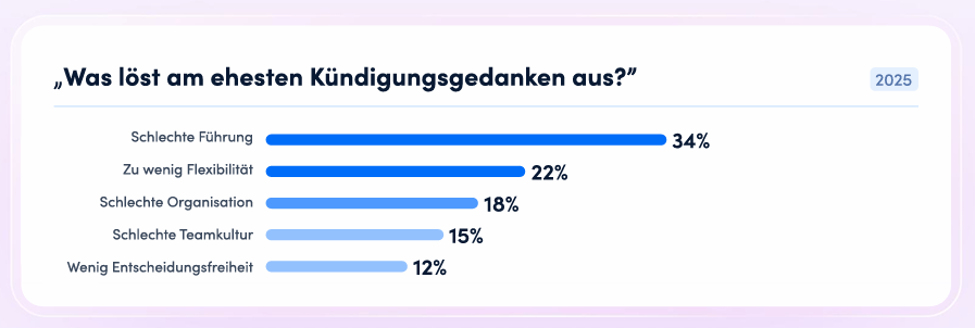 Einer der wichtigsten, wenn auch oft vernachlässigten Faktoren für Arbeitszufriedenheit ist Wertschätzung durch Führungskräfte. Menschen, die sich im Job gesehen und anerkannt fühlen, sind nicht nur motivierter, sondern auch loyaler. Fast 60 Prozent der Bleibewilligen gab an, sich stark wertgeschätzt zu fühlen – unter den Wechselbereiten sind es nur 38 Prozent. Noch dazu fühlt sich fast jede:r Fünfte in dieser Gruppe explizit nicht gewürdigt. Diese Lücke zwischen Wahrnehmung und Realität kann für Unternehmen teuer werden. Denn fehlende Anerkennung ist für viele Arbeitnehmer:innen ein klarer Kündigungsgrund. Wer hier investiert, profitiert von stärkerer Mitarbeiter:innenbindung und gesteigerter Motivation. Weitere Kündigungsgründe sind unter anderem eine schlechte Führung (34 Prozent), zu wenig Flexibilität (22 Prozent) oder eine schlechte Teamkultur (15 Prozent).