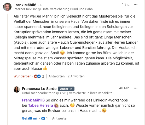 Ein gutes Beispiel für den kulturellen Wandel liefert die Corporate Influencerin Francesca Lo Sardo (Unfallversicherung Bund und Bahn) auf LinkedIn. In den Kommentaren schreibt sie, als Antwort auf den Kommentar eines Revisors (Kollege aus ihrem Unternehmen), dass sie erst durch das Corporate-Influencer-Programm erfahren hat, was ein Revisor eigentlich genau beruflich macht.