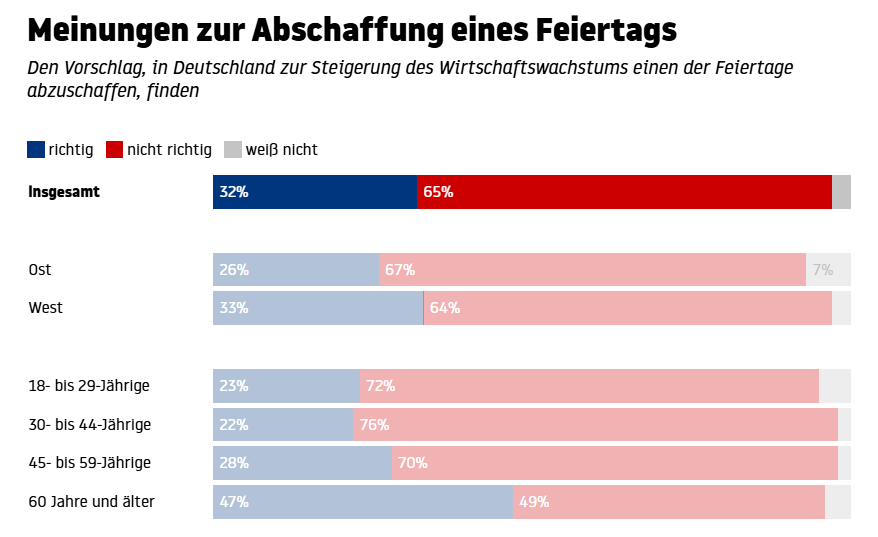 65 Prozent der Arbeitnehmer:innen in Deutschland lehnen die Abschaffung eines Feiertags ab, © Stern