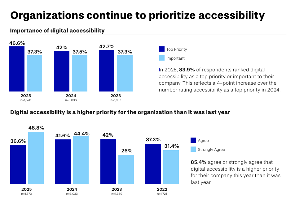 In der Praxis verstehen immer mehr Unternehmen, dass digitale Barrierefreiheit kein Nischenthema mehr ist. Laut einer aktuellen Umfrage unter über 1.500 Fachleuten aus den Bereichen Design, Entwicklung und Qualitätssicherung sehen 83,9 Prozent die Barrierefreiheit im Jahr 2025 als zentrale oder zumindest wichtige Priorität für ihr Unternehmen – ein Anstieg um vier Prozent gegenüber dem Vorjahr.