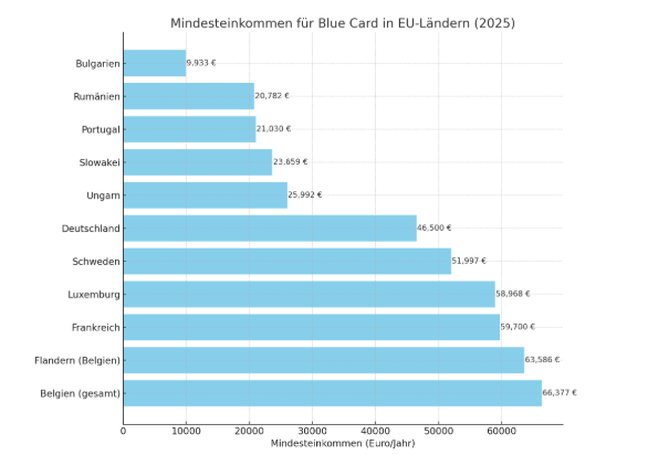 Die Mindesteinkommensgrenzen für die Blue Card in den verschiedenen Mitgliedstaaten (Grafik erstellt mithilfe von ChatGPT, Daten von der Gisma University of Applied Sciences)