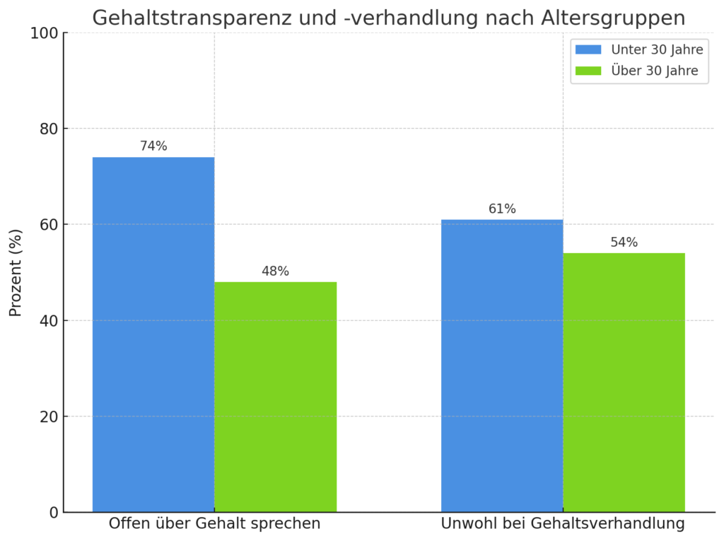 Rund 74 Prozent der unter 30-Jährigen geben an, offen über ihr Gehalt zu sprechen (KI-erstellte Grafik via ChatGPT)
