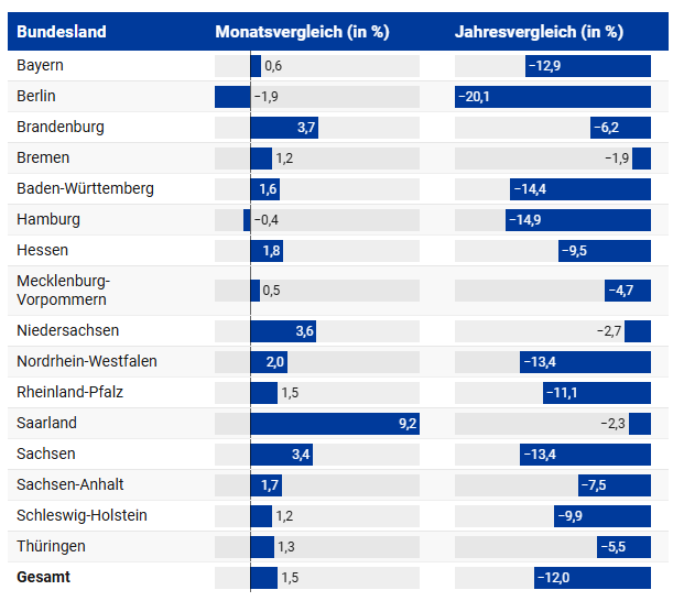 Ein Blick auf die Bundesländer macht die Uneinheitlichkeit noch deutlicher. Während in Berlin (minus 1,9 Prozent) und Hamburg (minus 0,4) weiterhin weniger Jobs ausgeschrieben wurden, zeigte sich in fast allen anderen Bundesländern ein leichtes bis deutliches Plus. Besonders stark war der Anstieg im Saarland mit 9,2 Prozent, wobei der dortige Stellenmarkt aufgrund der geringen Größe der Region naturgemäß volatiler reagiert. In den wirtschaftsstarken Regionen Bayern (plus 0,6), Baden-Württemberg (plus 1,6) und Nordrhein-Westfalen (plus 2,0) gab es immerhin kleine Zuwächse.