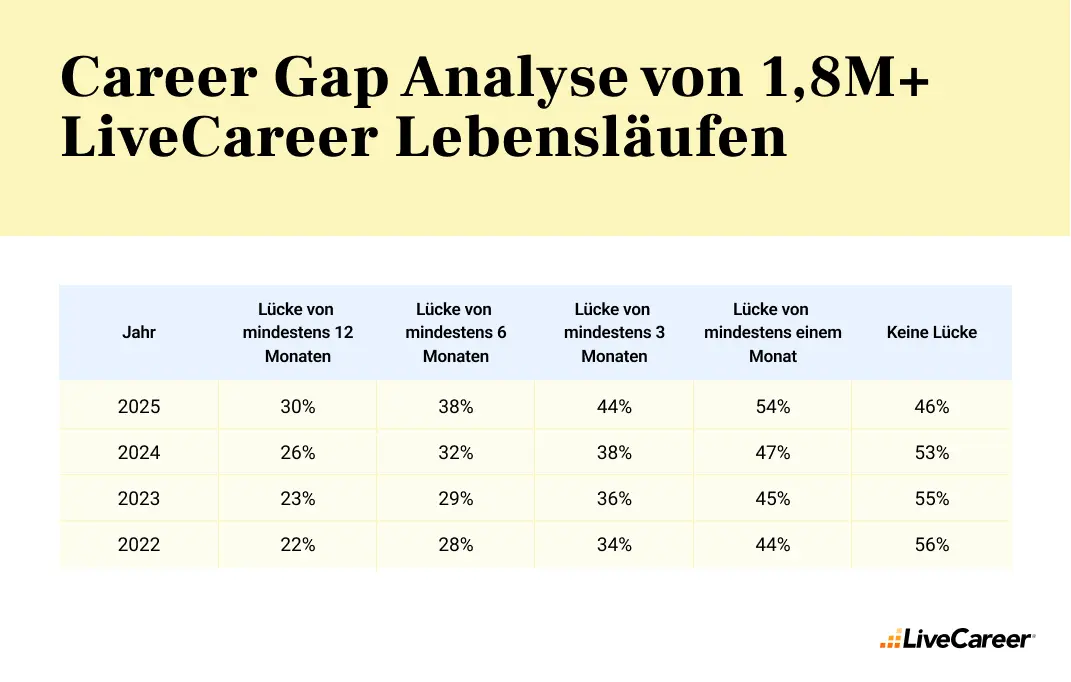30 Prozent der Lebensläufe im Jahr 2025 enthalten eine Lücke von mindestens zwölf Monaten (mit einem Klick aufs Bild gelnagst du zur größeren Ansicht), © LiveCareer