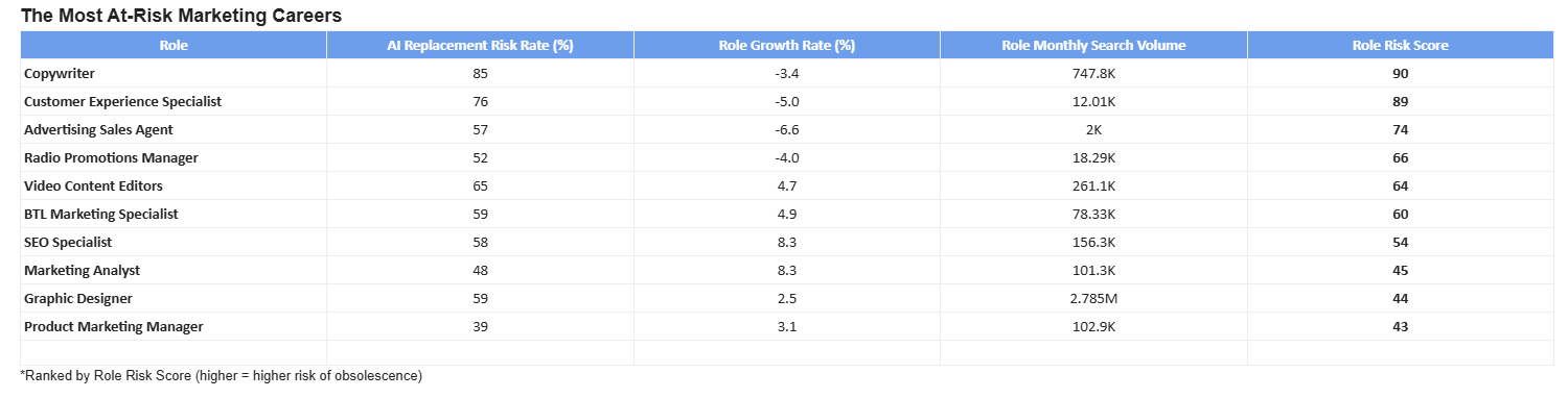 As the cost of words, edits, and standard campaign operations trends toward zero, any role built purely on output is under pressure. The market is telling us that repeatable work is no longer scarce. The roles that last aren’t the ones producing more. They’re the ones deciding what matters. Product marketers and analysts score lower risk not because they’re untouched by AI, but because they operate at the intersection of multiple careers. The advantage isn’t in how fast you can generate, but in how far you can expand. Prompting is just a skill. Quick judgment and flexibility are the differentiators.