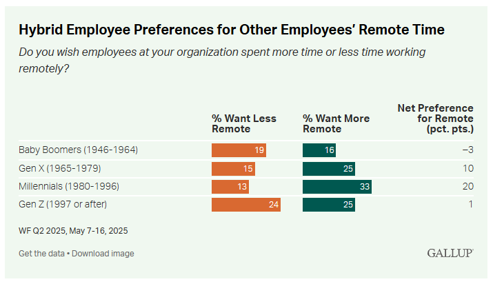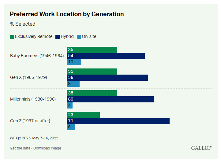 Nur 23 Prozent der Gen Z spricht sich für eine vollständig Remote-Arbeitsweise aus (mit einem Klick aufs Bild gelangst du zur größeren Ansicht), © Gallup