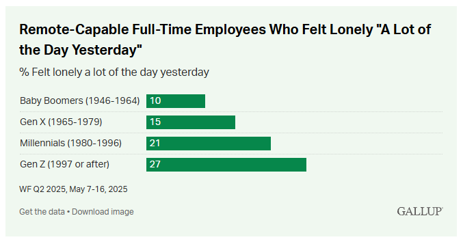 Warum also zieht es Gen Z vermehrt ins Büro? Eine mögliche Erklärung: Einsamkeit. Laut Gallup ist Gen Z die Generation mit den niedrigsten Lebenszufriedenheitswerten im Job – und der höchsten Einsamkeit. Sie ist fast doppelt so häufig wie die Generation X und beinahe dreimal so oft wie die Babyboomer:innen von starker Einsamkeit betroffen.