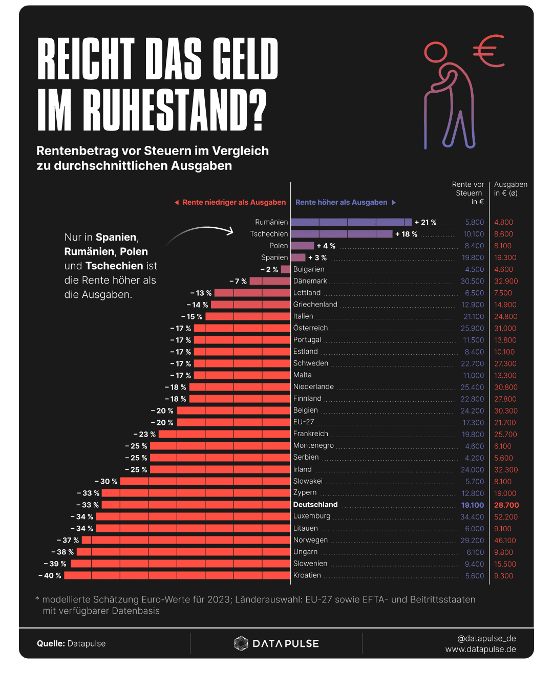 Eine aktuelle europaweite Untersuchung von Datapulse hat genau das unter die Lupe genommen. Sie verknüpft zwei Datensätze, die sonst getrennt betrachtet werden: staatliche Rentenzahlungen und die tatsächlichen Lebenshaltungskosten älterer Menschen – inflationsbereinigt auf das Preisniveau von 2023. Heraus kommt ein ziemlich nüchternes Bild der „Renten-Wirklichkeit“.