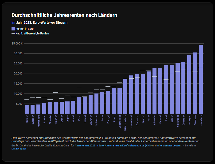 34.000 Euro in Luxemburg klingen nach Wohlstand. Aber: Die Lebenshaltungskosten dort sind extrem hoch. Rechnet man die Rente in Kaufkraft um, entspricht sie eher rund 23.000 Euro. Umgekehrt wirken 4.479 Euro in Bulgarien erschreckend niedrig, durch das geringere Preisniveau ergibt sich jedoch eine Kaufkraft von etwa 8.000 Euro.