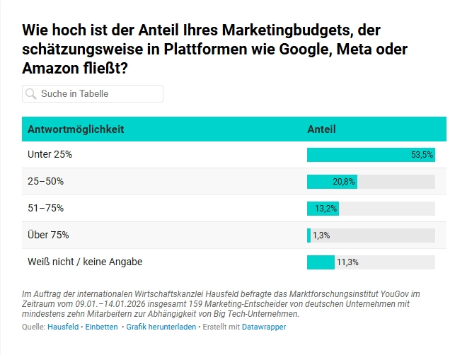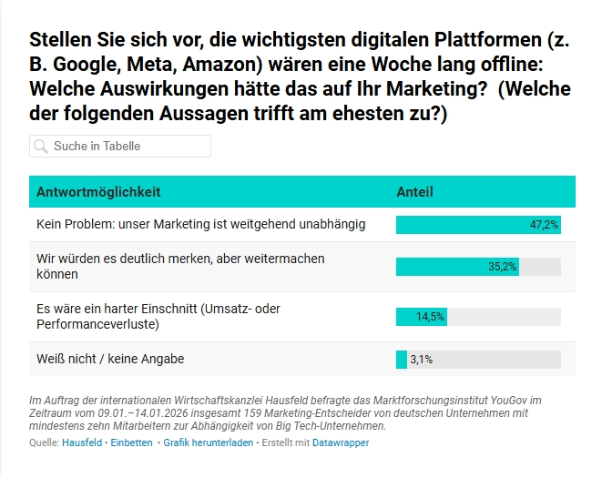 Was würde passieren, wenn über Nacht zentrale digitale Werbekanäle ausfallen? Wenn Kampagnen nicht mehr ausgespielt werden, Zielgruppen nicht mehr erreicht werden können und Performance Dashboards schlicht leer bleiben? Auch wenn dieses Szenario wie ein theoretisches Gedankenspiel wirkt, offenbart eine aktuelle Studie: Jedes zweite Unternehmen ist stark von Big-Tech-Unternehmen abhängig und hätte nach einer Woche drastische Probleme. Die Erkenntnis stammt aus einer Befragung der Wirtschaftskanzlei Hausfeld gemeinsam mit dem Marktforschungsinstitut YouGov und zeigt: Ein erheblicher Teil der Unternehmen in Deutschland ist im Marketing stark von US-amerikanischen Digitalkonzernen abhängig – allen voran Google, Meta und Amazon.