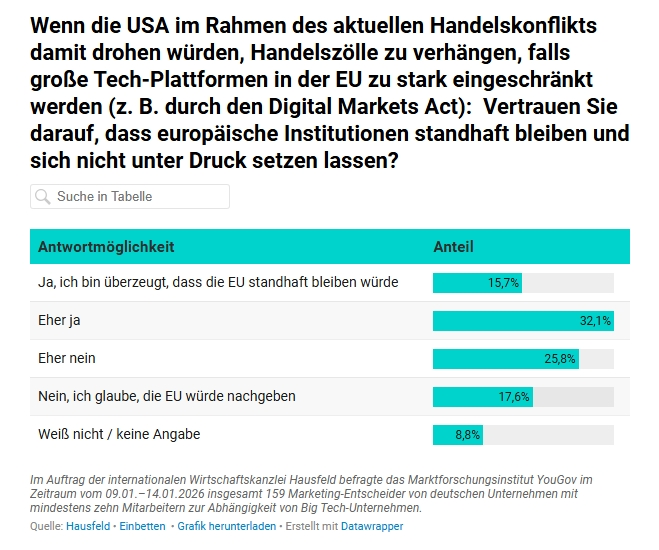 Lediglich 15,7 Prozent der Marketing-Entscheider:innen sind überzeugt, dass die Europäische Union im Falle wirtschaftlichen Drucks aus den USA standhaft bleiben würde (mit einem Klick aufs Bild gelangst du zur größeren Ansicht), © Hausfeld