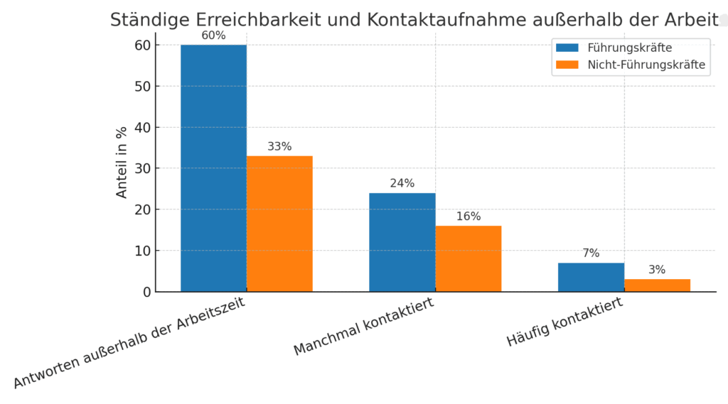 60 Prozent der Führungskräfte antworten auch außerhalb der Arbeitszeit auf berufliche Anfragen (mit einem Klick aufs Bild gelangst du zur größeren Ansicht; Grafik anhand der Protime-Studie mithilfe von ChatGPT erstellt)