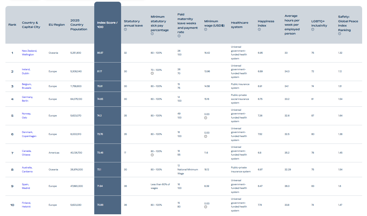 Der Index berücksichtigt eine Vielzahl an Kriterien – von der Anzahl bezahlter Urlaubstage über Mutterschutzregelungen, Mindestlöhne und Lohnfortzahlung im Krankheitsfall bis hin zur allgemeinen Sicherheitslage, LGBTQI+-Inklusion und Zufriedenheit der Bevölkerung.