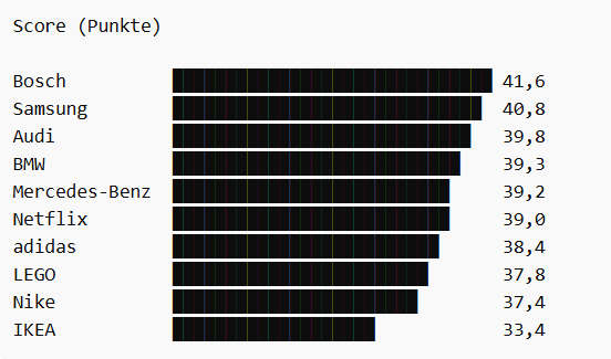 Und das Ergebnis? Welches Unternehmen hat das beste Image? Überraschend wenig Startups, dafür viele etablierte Schwergewichte. Ganz vorn liegt der Technologiekonzern Bosch mit einem Score von 41,6 von 100 Punkten. Dahinter folgt Samsung mit 40,8, dicht gefolgt von Audi (39,8). Die Zahlen zeigen klar: Vertrauen, Stabilität und Markenstärke zahlen sich aus.