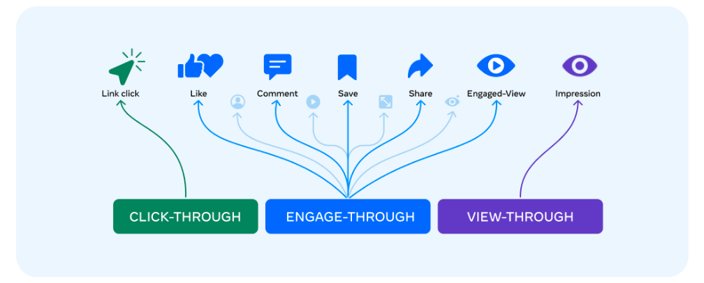 Damit fortan auch die Interaktionen abseits der Link Klicks klar definiert als Messgröße eingeordnet werden können, subsumiert Meta diese unter der Engaged-View-Attribution. Allerdings wird diese in Zukunft Engage-Through-Attribution heißen, um dem Namen nach der gleichen Systematik wie Click-Through-Attribution zu folgen. Die Attribution betrifft Shares und Likes sowie Saves und Kommentare. Außerdem werden sogenannte Engaged Views miteinbezogen. Dabei handelt es sich um Videoansichten von mindestens fünf Sekunden. Zuvor lag der Wert bei zehn Sekunden, doch Meta meint: