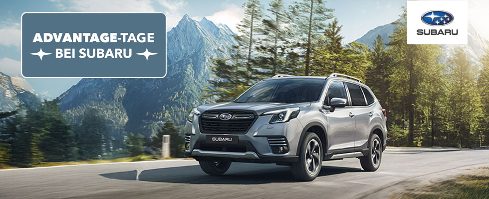 Auto Subaru Forester vor Bäumen und Bergpanorama auf Straße, Subaru-Logo, Schriftzüge und Label mit Werbehinweis auf dem Bild
