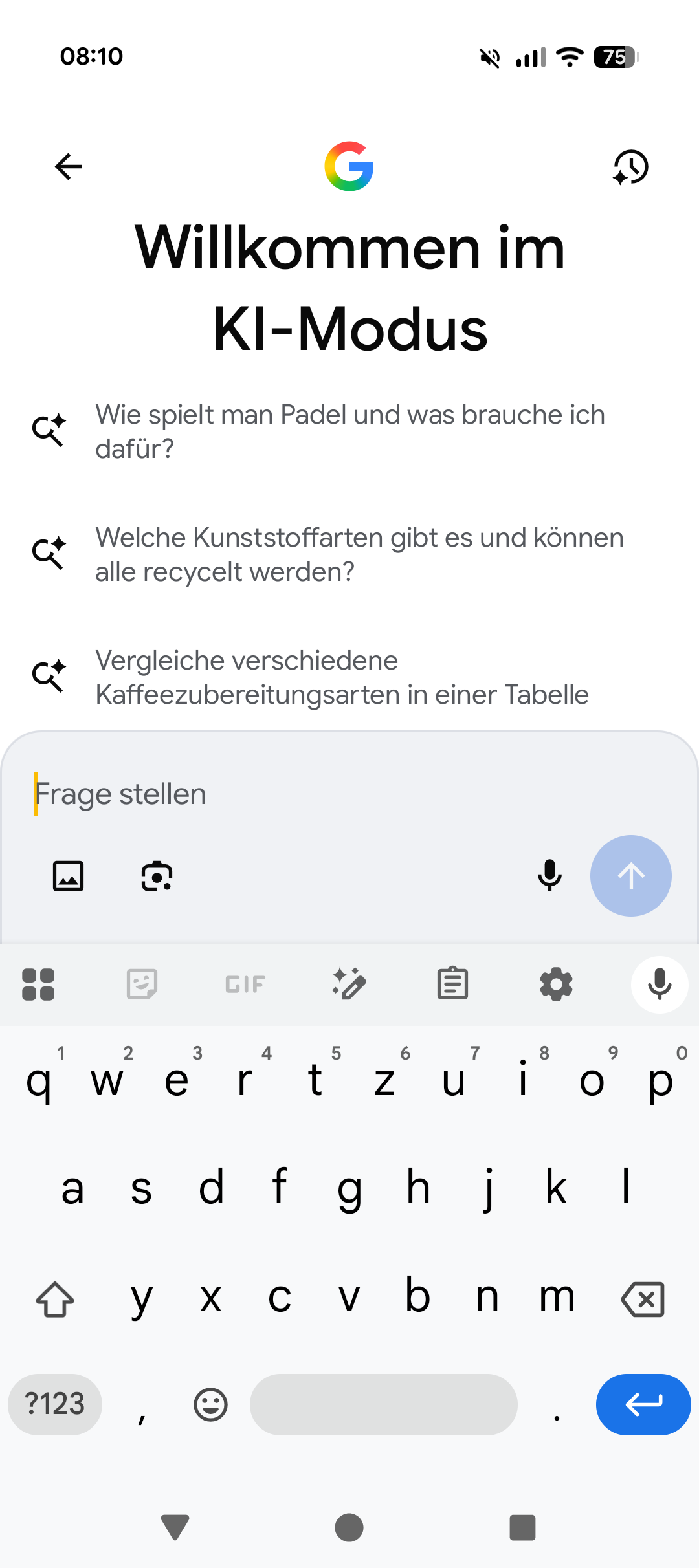 Im AI Mode kannst du deine Fragen stellen, auch per Stimme, auf vorgeschlagene Fragen von Google eingehen oder multimodal mithilfe von Bilder aus deiner Galerie oder Aufnahmen mit der Kamera suchen. Google rät dabei: