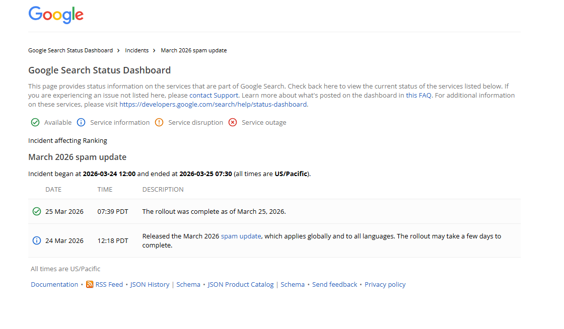 Das jüngste große Search Update Googles, das March 2026 Spam Update, ist schon nach einem Tag abgeschlossen worden. Google hatte zunächst angekündigt, dass der Roll-out ein paar Tage in Anspruch nehmen könnte. Doch weniger als 24 Stunden später wurde der Ausrollprozess abgeschlossen. Das zeigt ein Blick in das Google Search Status Dashboard.