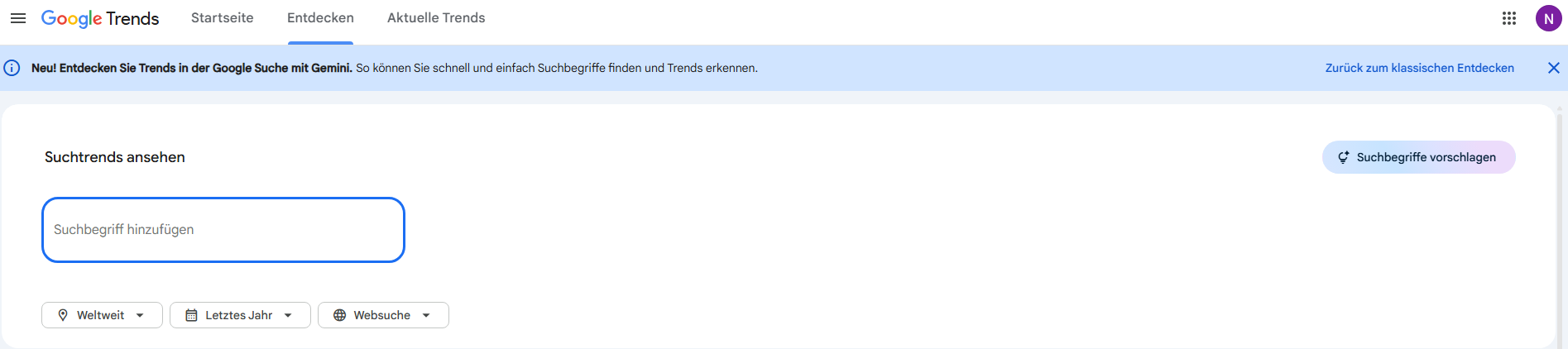 Schon im Januar kündigte Google die Unterstützung durch Gemini im Google Trends-Bereich an. Jetzt ist es so weit und User können auch in Deutschland Googles KI nutzen, um relevante Trends zu identifizieren. Das zeigt ein Blick auf die Explore Page von Google Trends.