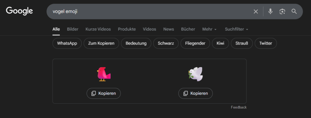 Auch wir sehen diese Box schon. Bei konkreten Anfragen wie zum „Sad Emoji“ (siehe Titelbild) liefert Google das passende Bildzeichen sowie ein verwandtes. In diesem Fall sind es das weinende Gesicht und das enttäuschte Gesicht. Bei etwas vageren Anfragen wie nach dem „Vogel Emoji“ finden User Beispiel-Emojis.