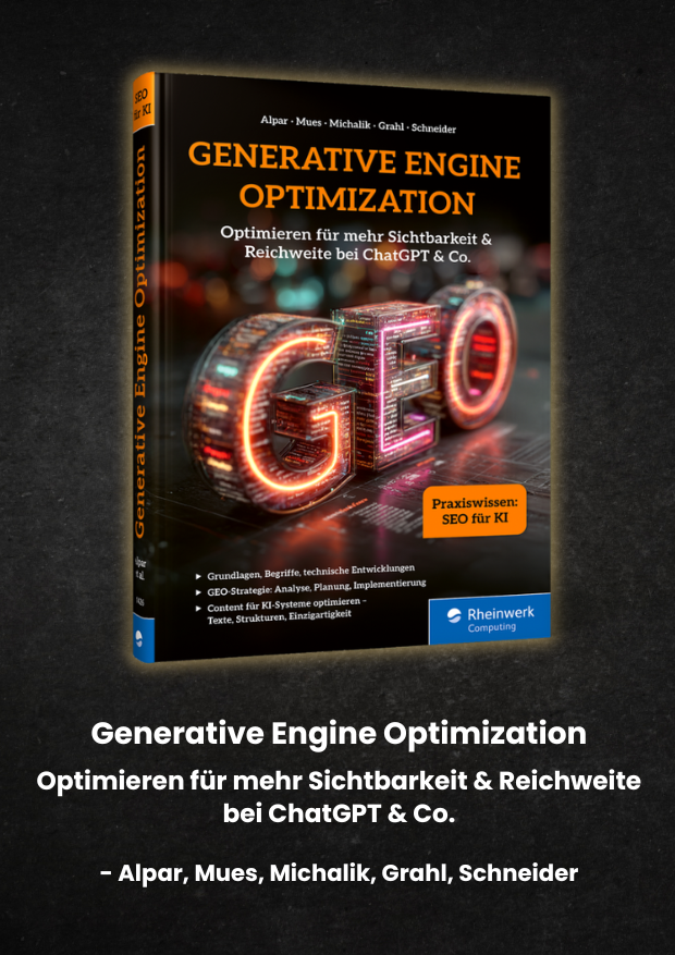 Unabhängig von diesem Beitrag, aber passend zur Veröffentlichung desselben und des neuen Buches Generative Engine Optimization: Optimieren für mehr Sichtbarkeit & Reichweite bei ChatGPT & Co. verlost OnlineMarketing.de zwei Ausgaben des GEO-Werkes unter allen Interessierten. Bis zum 31. März hast du die Chance, es dir kostenfrei zu sichern.