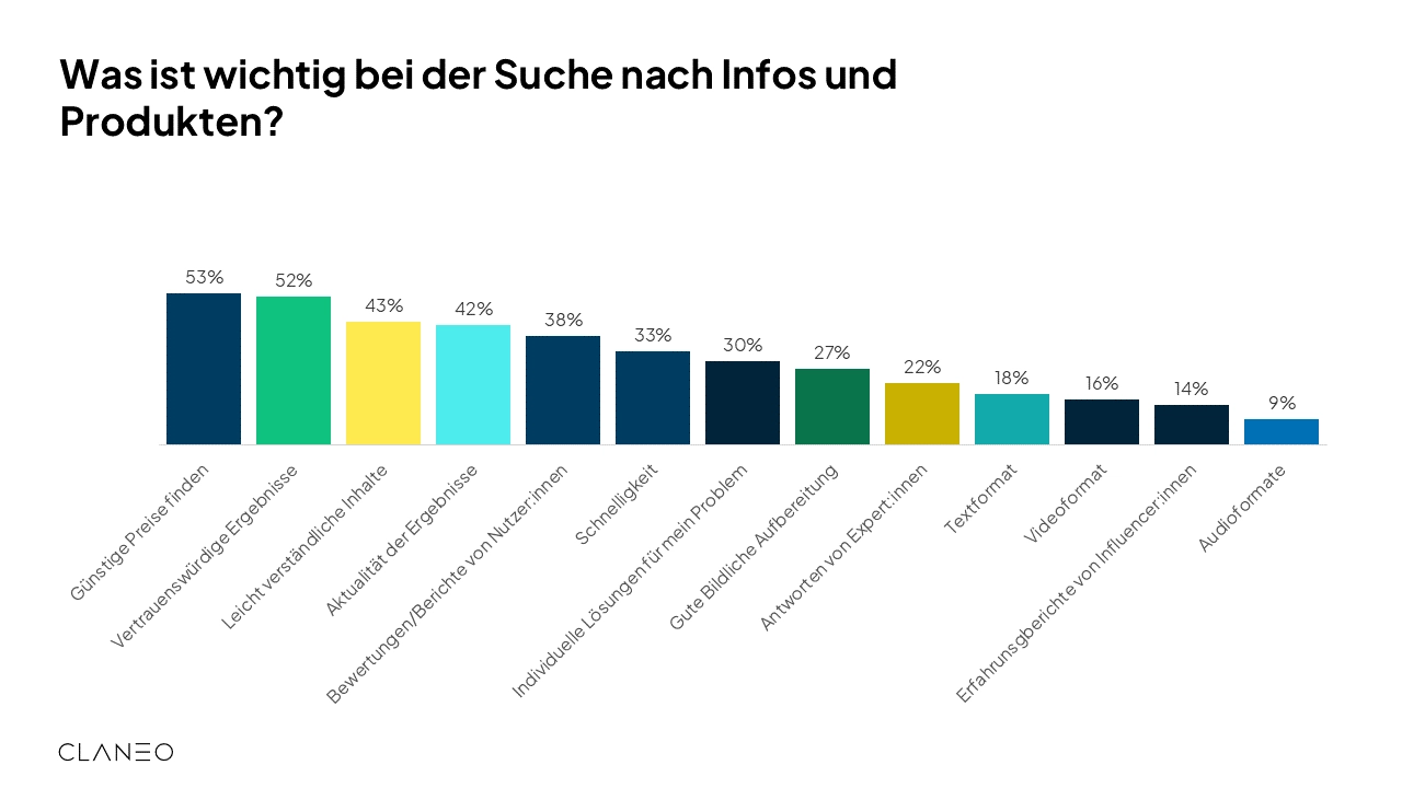 Eine besonders für Marken relevante Frage ist jene nach der favorisierten Plattform bei der Produktsuche. Auch hier bleiben Google und Co. mit 53 Prozent an erster Stelle, gefolgt von Amazon mit 50 Prozent. Die Generation Z sucht zudem gern auf Social Media – TikTok (19 Prozent) und Instagram (17 Prozent) sind bei der Produktsuche beliebter als KI-Chatbots (11 Prozent). Insgesamt legen die Befragten bei der Suche nach Informationen und Produkten vor allem Wert darauf, günstige Preise zu finden und vertrauenswürdige Ergebnisse zu erhalten.