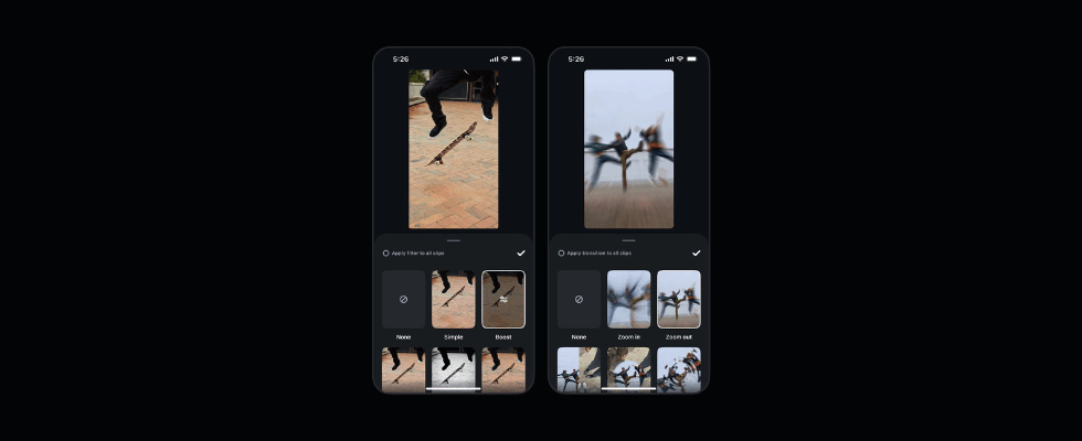 Screenshot aus Instagram Edits zeigt die neue Apply all-Funktion, mit der Nutzer:innen Effekte und Filter auf alle Clips eines Projekts gleichzeitig anwenden können.
