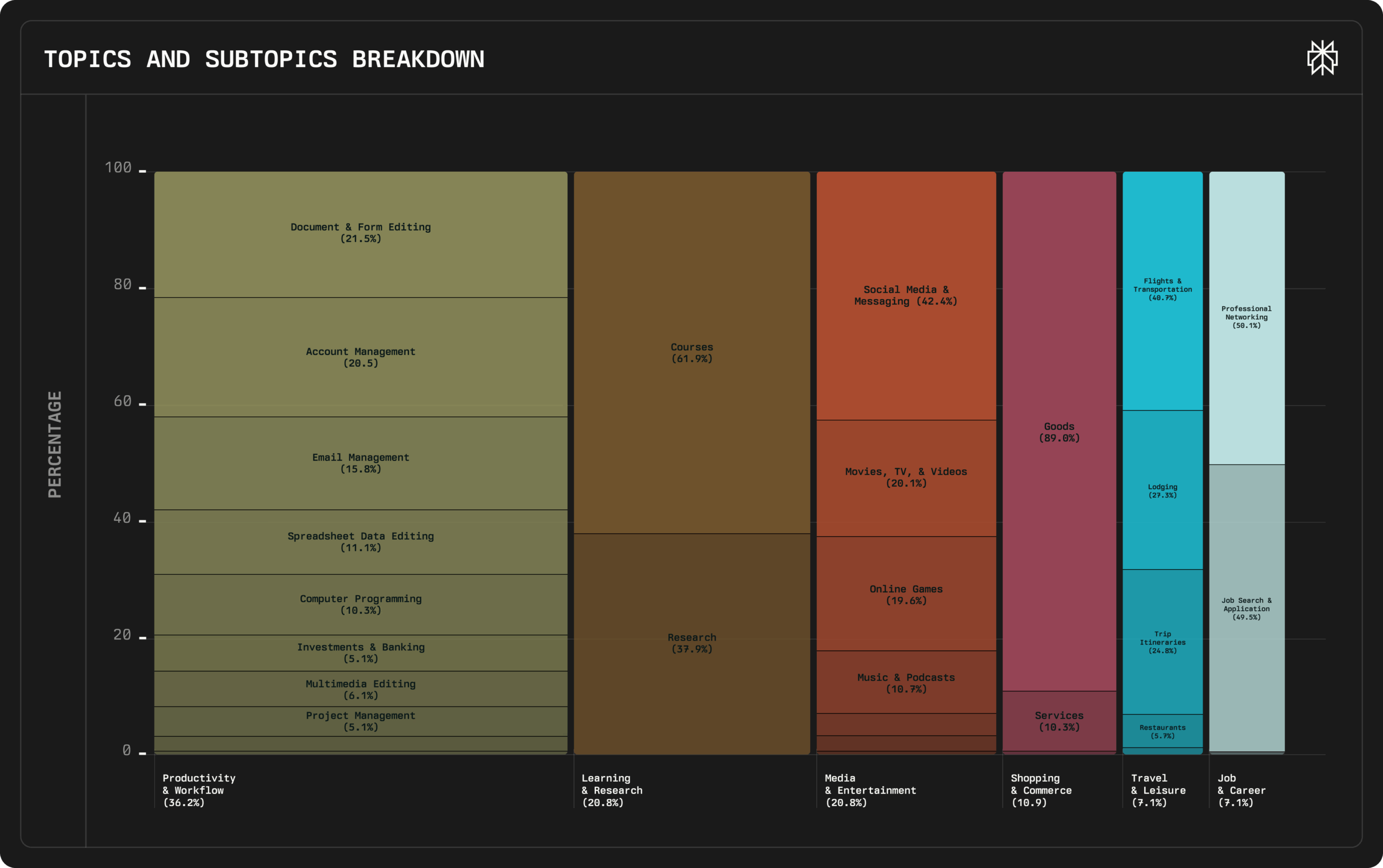 Während bekannte Einsatzmuster zur Bearbeitung und Verwaltung von Dokumenten, Programmen, Mails und Co. dominieren, gewinnen Nutzungskontexte wie das AI-gestützte Shopping, Networking und Entertainment an Gewicht – was ganz im Sinne neuer Funktionen ist, mit denen Perplexity künftig mehr User und Umsatz generieren möchte.