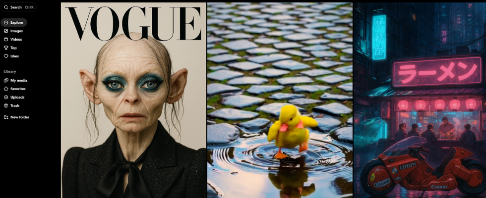 Screenshot des Explore-Bereichs von Sora mit mehreren KI-generierten Videos, darunter eine junge Frau im Cosplay Look, ein Motorrad vor einem Neonimbiss, eine gelbe Gummiente in einer Pfütze und eine rauchende Katze vor einem weißen Auto.