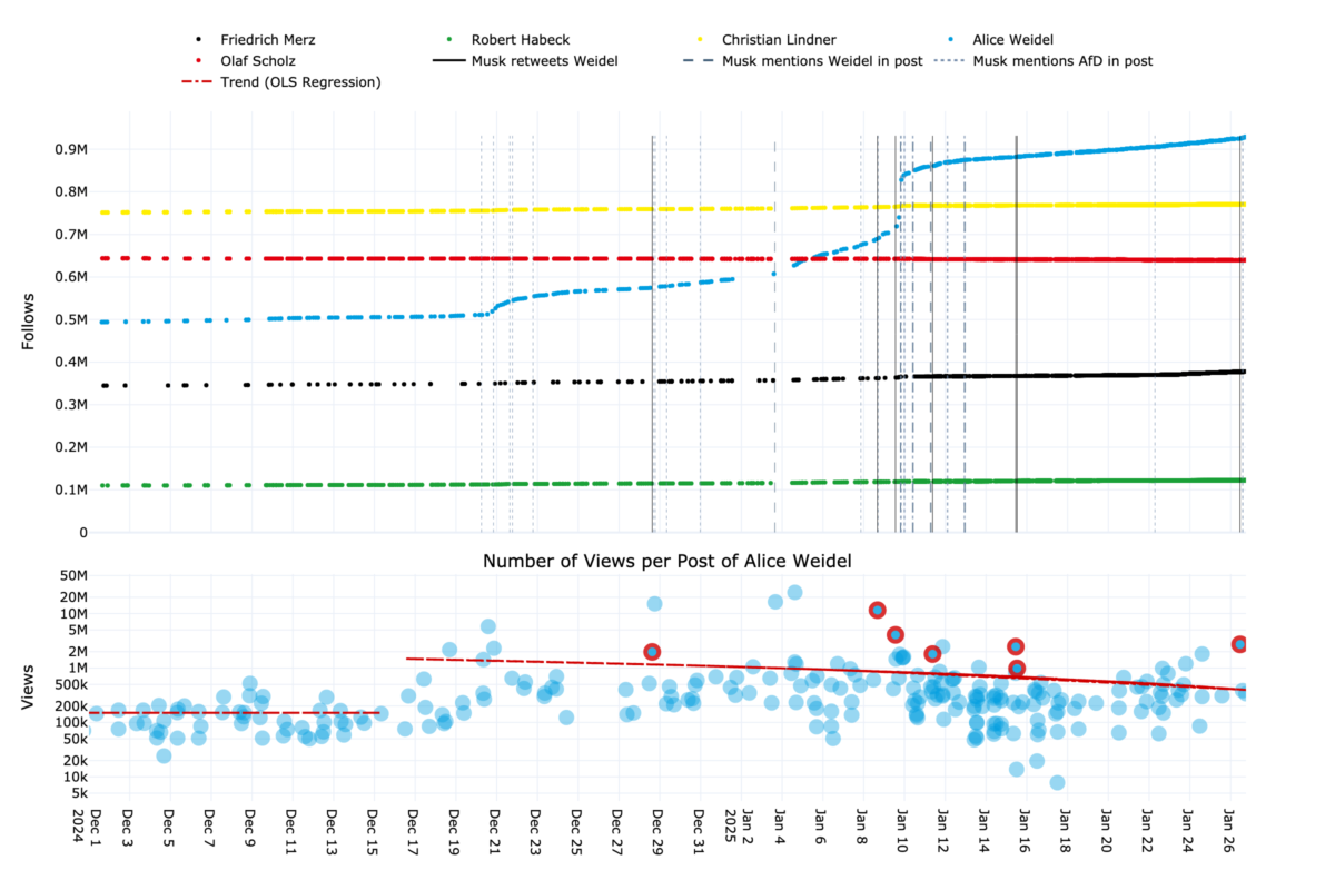Im untersuchten Zeitraum von Anfang Dezember 2024 bis Ende Januar 2025 stieg die Zahl der X Follower von Alice Weidel von rund 500.000 auf über 900.000. Gleichzeitig stiegen die Views einzelner Posts von wenigen Hunderttausend auf teils über zehn Millionen. Vergleichbare Effekte waren bei anderen politischen Accounts nicht zu beobachten.
